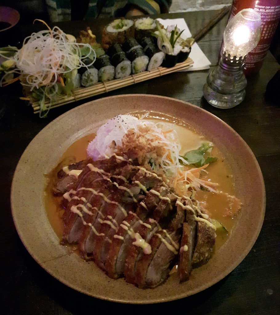 Irgendwie fuhr anschließend der Nachtbus nicht und wieder nicht – ich zahlte also super unnötige 15 Euro für bloßes Heimfahren – arbeitete ein wenig am Roman, schlief und machte mich irgendwann leicht verspätet auf den Weg zur Sushifreundin. Obwohl Themen wie Essstörung, Gewalterfahrungen und massive Therapiefails auf den Tisch kamen, gönnten wir uns (= der Name ist Programm 😆):
