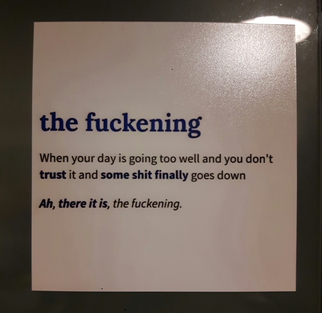 6.) mit einem Spruch, der an einem der hiesigen Küchenschränke klebt und der mich sehr zum Lachen brachte: