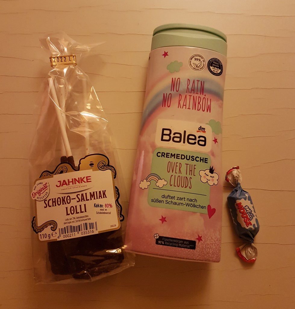 1.) Das geschenkte Zuckerwatteduschgel, die Salmiaklollis und ein Schoko-Bon-Imitat.