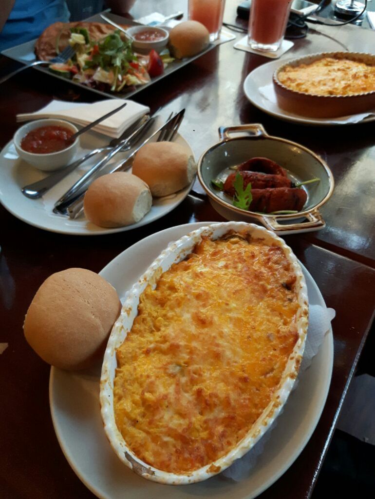 Genauso mit zwei enormen Näpfen voller Champignonspätzle, Schweinemedaillons, Ciabatta und Beilagesalaten.