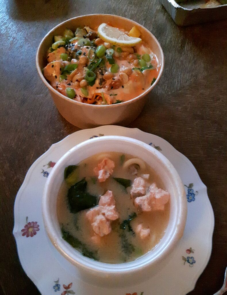 Nämlich: eine Vorspeisen-Udon-Suppe mit Seetang und *LACHS*, und eine Bowl mit Mango, Möhren, Seetang, Edamame, Sushireis, Erdnüssen, scharfer Cocktailsauce, süßer Mayonaise, Sesam, Thunfisch und wieder *LACHS*: