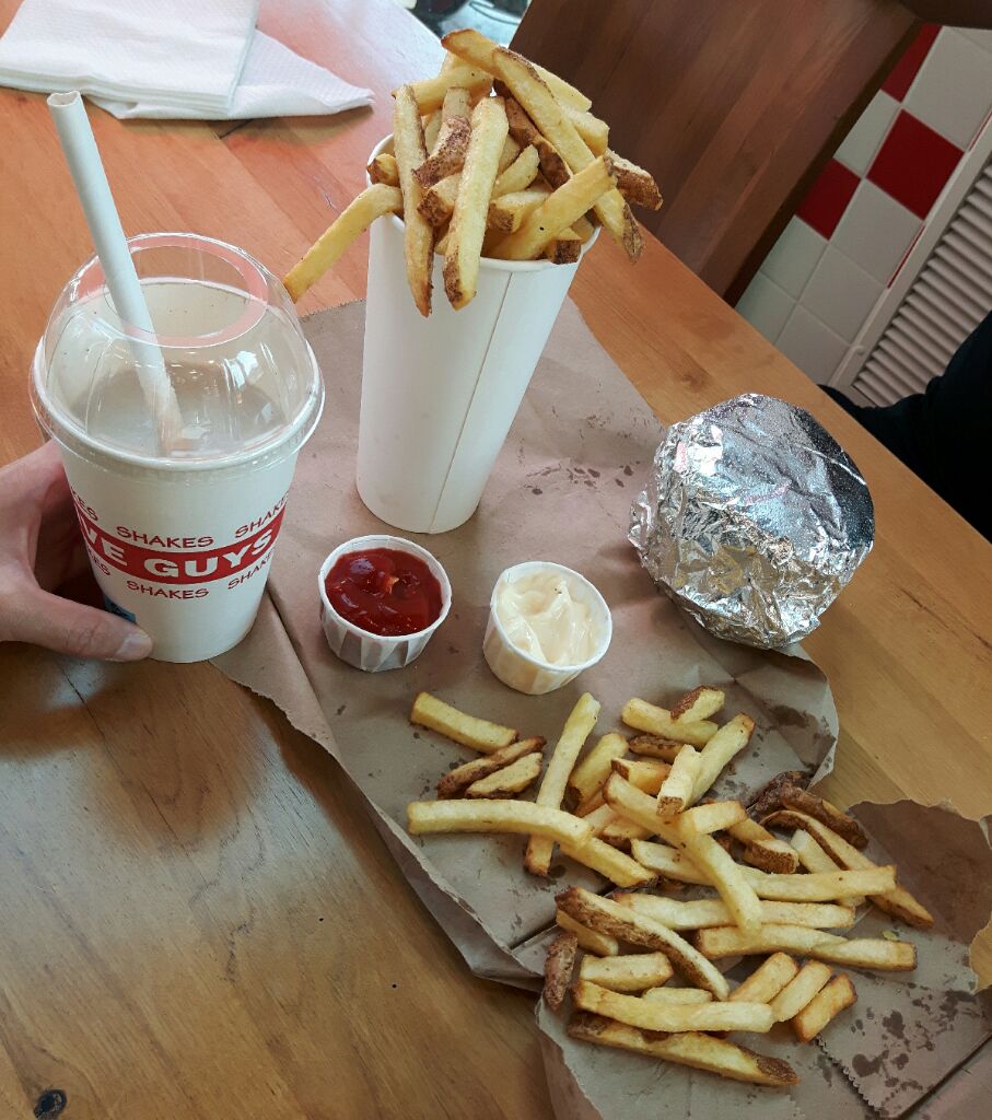 Ein Teil der Belohnung und Anti-Kater-Methode vor unserer Abreise bestand dann in einem Gang zu „Five Guys“, wo wir völlig unromantisch aus einer ausgerissenen Papiertüte aßen.