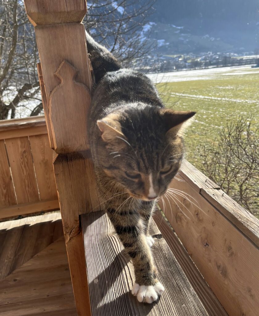 Ich sach ja: IRRE. Vor einem Menschen mit *dem* Blick und *dem* Grinsen sollte man jedenfalls besser flüchten. 😂Hier wollte sie direkt zu mir und auf mich klettern. Zwei Sekunden später trat es ein. 😆Und auf der Balkonbrüstung auf und ab zu tigern ist ja eh ihr Ding. 😊