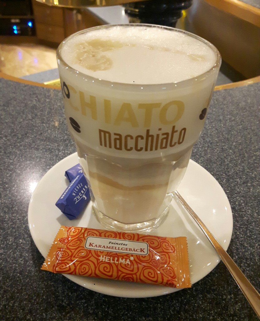 Der Latte Macchiato. Diesmal noch mit dem Schaum, aber ohne „Lotus Biscoff“-Keks. 😆