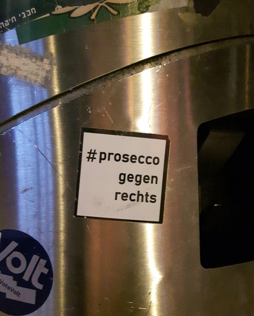Anscheinend gibt es wohl sogar eine ganze gemeinnützige Organisation inklusive Veranstaltungen, Instagram, Facebook und Co. zu „proseccogegenrechts“, ABER für mich war es beim Ablichten zunächst bloß ein Sticker von vielen Stickern, der mich erheiterte.