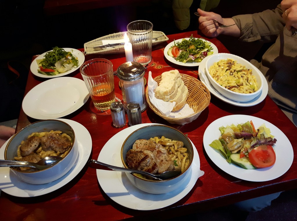 Und danach ein spätzlereiches Festmahl mit viel Salat – bei mir vorne links OHNE RUCOLA. 😇