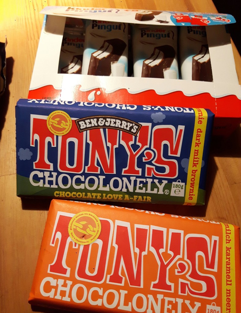 Seitdem futterten wir Nachos mit Sour Cream, extra salzig gefüllte Salmiakbonbons, zimtige Cerealien mit Vollmilch, zwei Sorten Schokolade – der Marke Tony’s Chocolonely – und Kinder Pingui aus dem Großpack. 😆