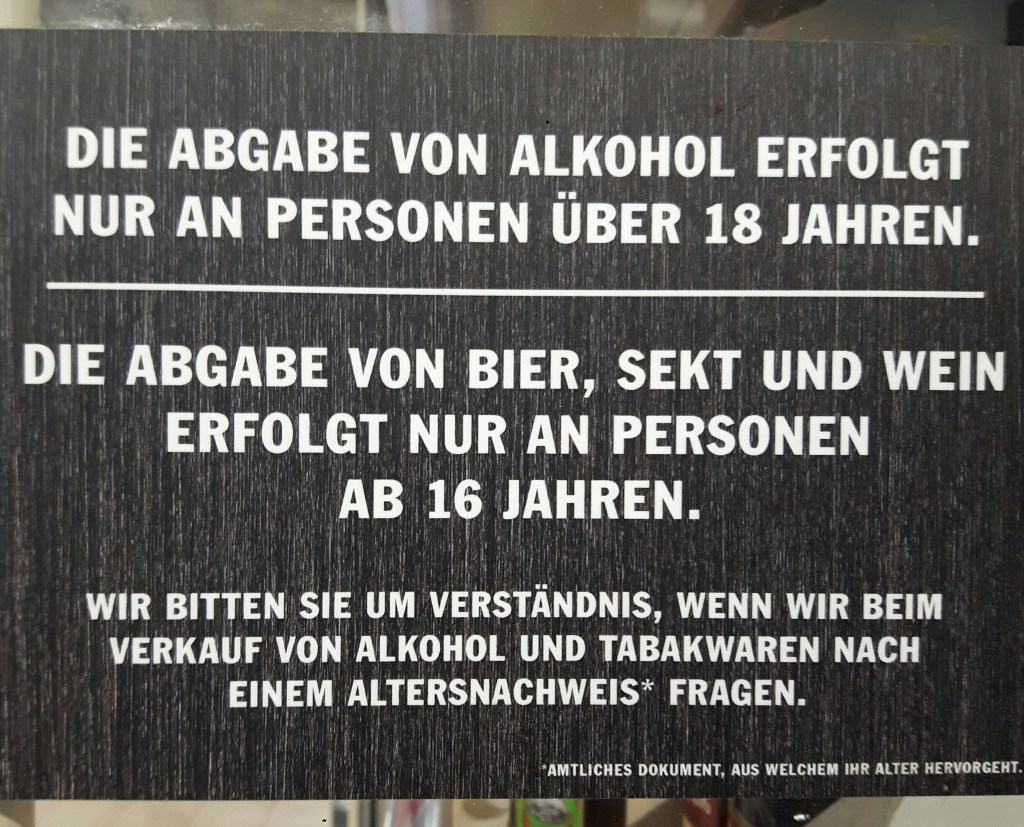Und 3.) „DIE ABGABE VON ALKOHOL ERFOLGT NUR AN PERSONEN ÜBER 18 JAHREN. –