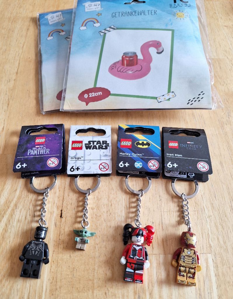 Er bekam von mir kürzlich zwei aufblasbare Getränkehalter in Form eines Rosaflamingos (= weil er ja gerne mit erfrischenden Drinks in Badewannen oder Pools herumlungert) und ich bekam in den vergangenen Wochen nach und nach drei Lego-Schlüsselanhänger: