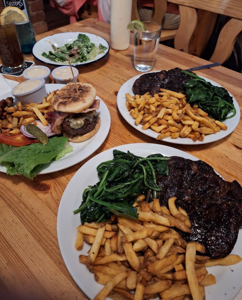 Die neue Freundin wollte 400 Gramm Rib Eye Steak – medium – und einen Caesar-Salat mit Anchovis essen, was beides außerdem im Fotohintergrund herumsteht. Zu alldem gab es haufenweise Fritten, Blue Cheese Dip und extrem knackigen Blattspinat.