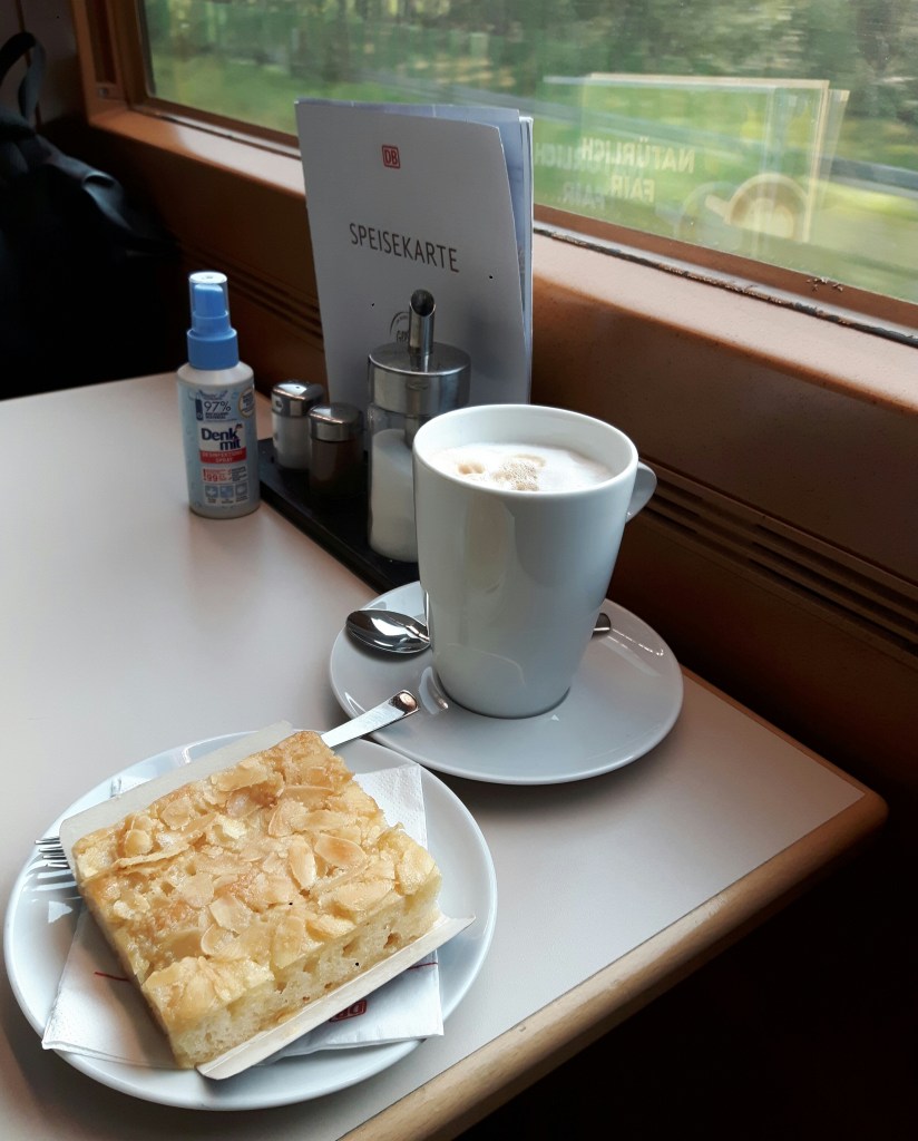Jedenfalls bin ich happy, bestellte mir zu Feier des Anlasses *Butterkuchen* und will die Fahrt nun mit Schreiben und Sein verbringen.