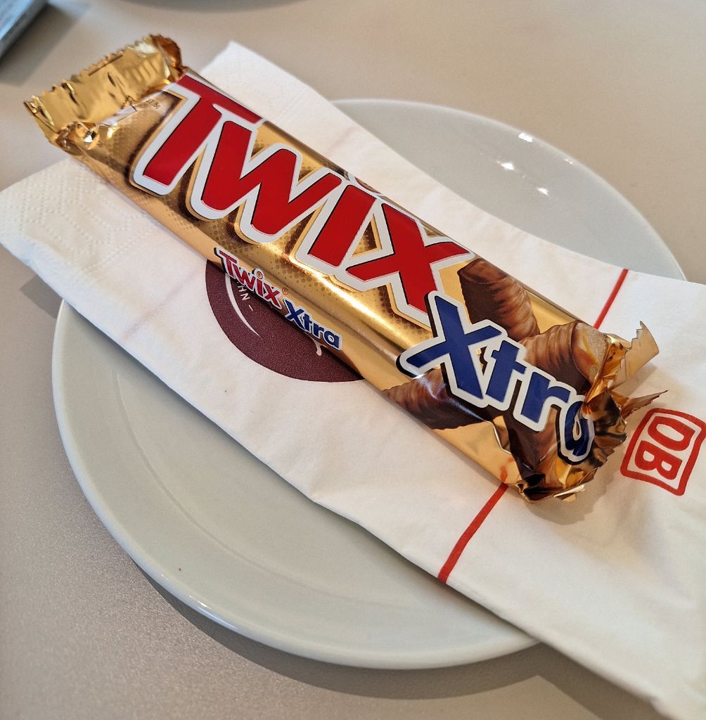 P.S.: für das Bordbistro besaß ich dieses Mal diverse Verzehrgutscheine, weil ich ja dauernd so viel Bahn fahre. Um beim Einlösen keine Restsumme(n) verfallen zu lassen, orderte ich zu meinen Getränken ein Twix. Das wurde kurioserweise wie folgt serviert…