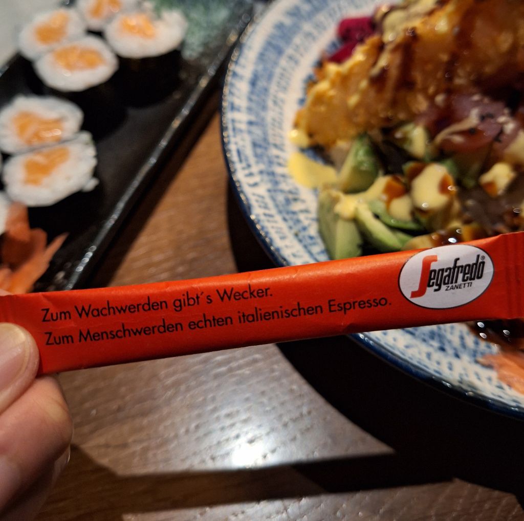 Kleiner Fund beim Essengehen gestern: ein „Segafredo“-Zuckertütchen mit Spruch, der etwas zuuu nahe an meiner Lebensrealität dran war.