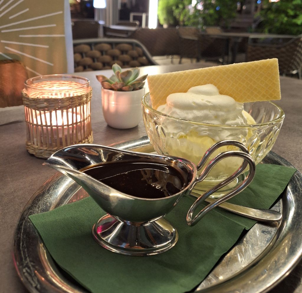 Und danach Vanilleeis mit Sahne und warmer Schokosauce.
