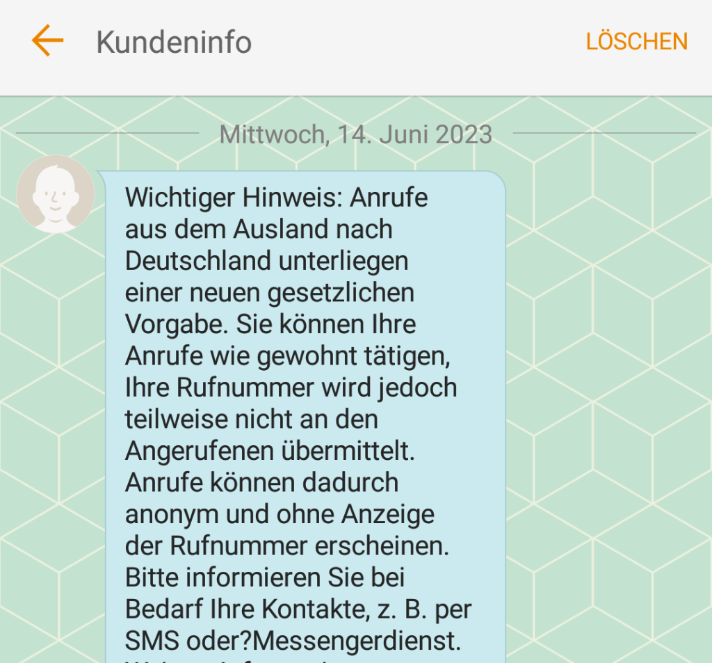 Wichtiger Hinweis: Anrufe aus dem Ausland nach Deutschland unterliegen einer neuen gesetzlichen Vorgabe. Sie können Ihre Anrufe wie gewohnt tätigen, Ihre Rufnummer wird jedoch teilweise nicht an den Angerufenen übermittelt. Anrufe können dadurch anonym und ohne Anzeige der Rufnummer erscheinen. Bitte informieren Sie bei Bedarf Ihre Kontakte, z. B. per SMS oder?Messengerdienst.