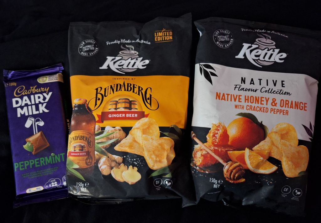 Nämlich Cadbury Peppermint (= „PROUDLY MADE IN TASMANIA“), Ginger-Beer-Chips und „Native Honey & Orange Chips“ mit Pfeffer. 😊